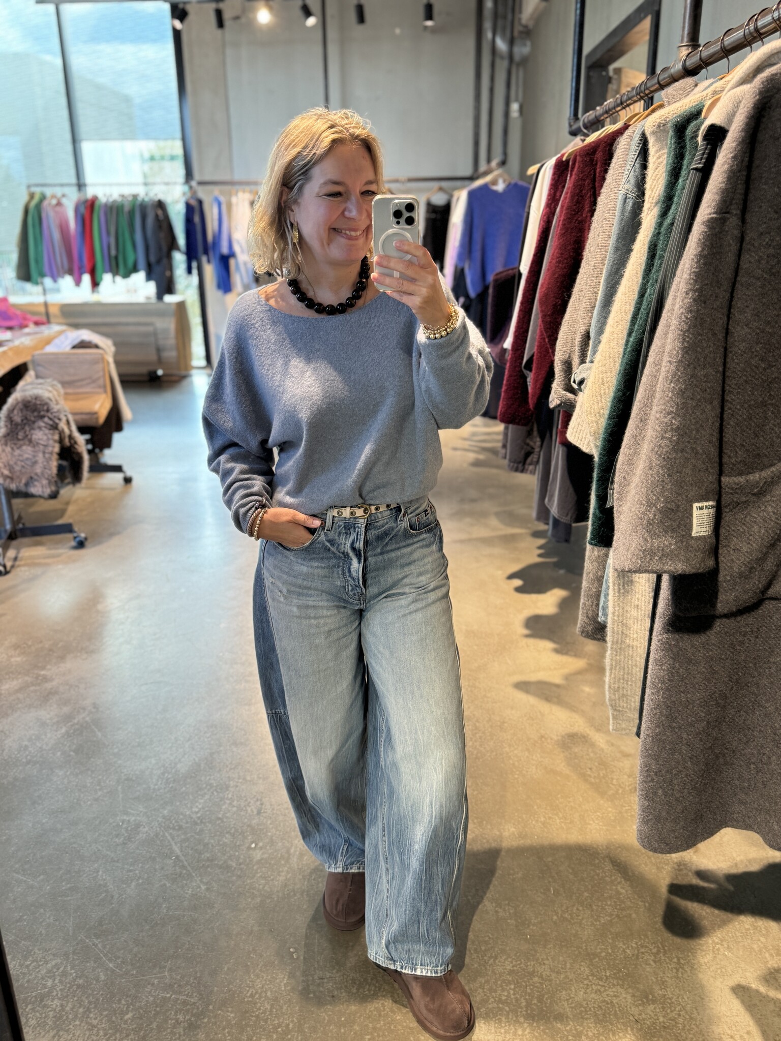 De bekende dam trui van American Vintage, een bestseller. Hij heeft een wijde boothals en kan offshoulder. Hij valt ruim, xs/s past zeker t/m m. Neem m/l als je normaal l/xl draagt. Hij is van wol, maar prikt niet! Nu in deze prachtige blauwgrijze kleur.