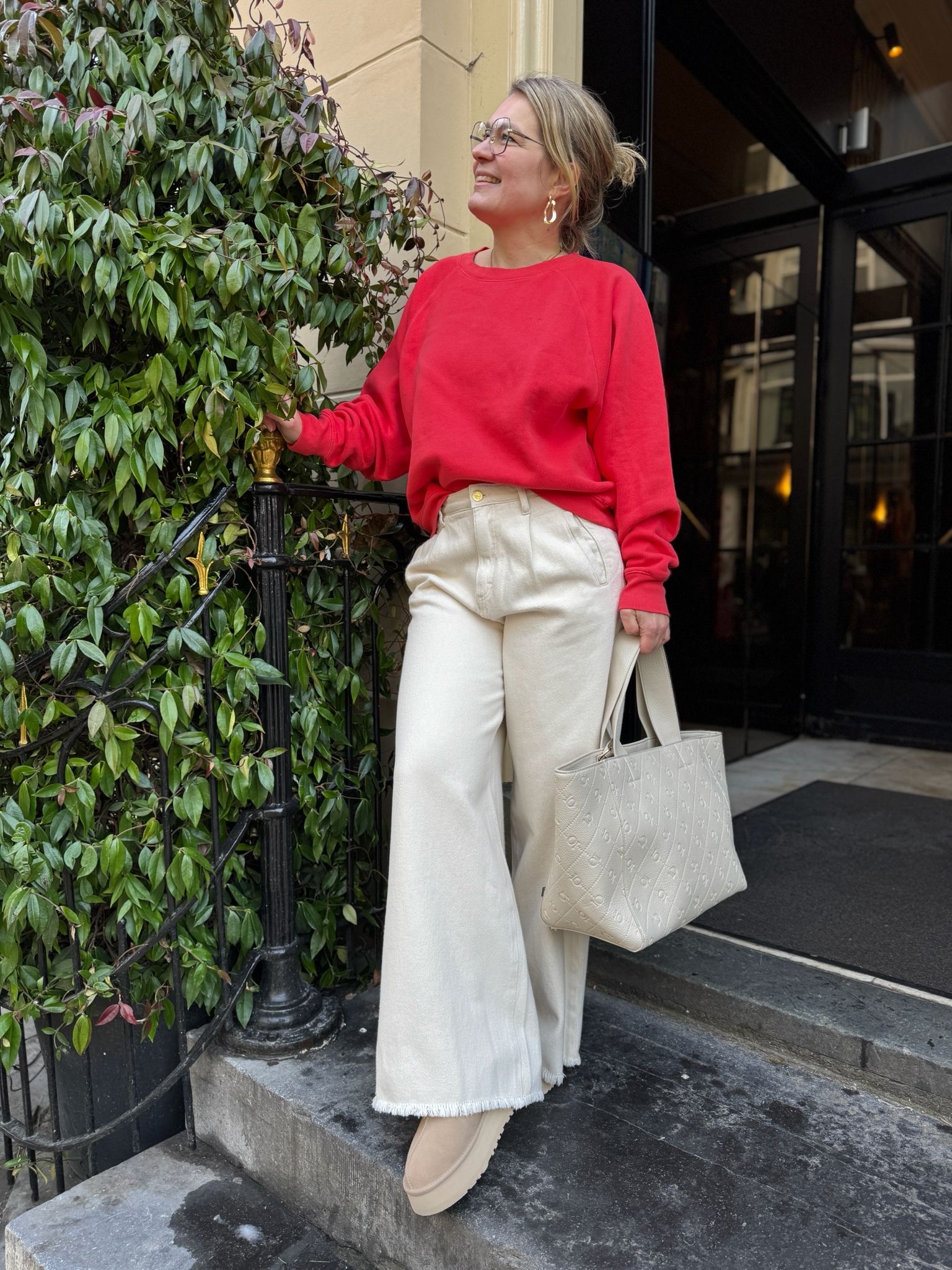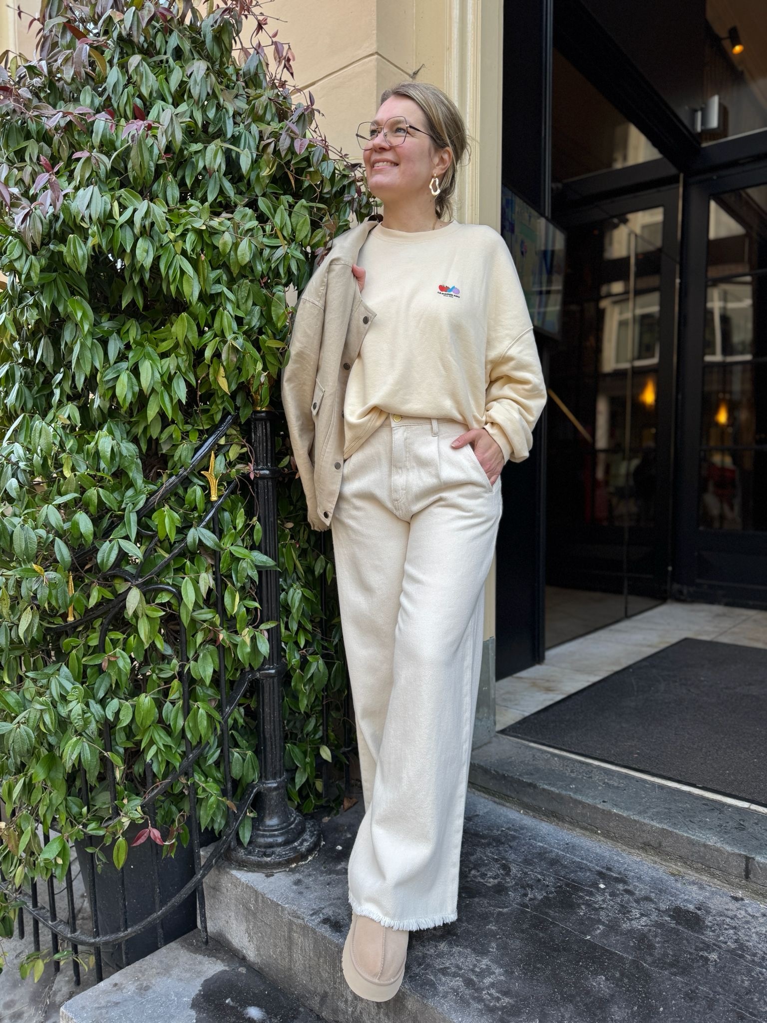 Ecru wideleg jeans van By Bar. Een nieuw model met bandplooi, helemaal on trend. De onderkant is onafgewerkt. Hij valt echt highwaist en strak in de taille. Neem een maat groter, tenzij je erg smal bent in de taille. Hij valt niet lang. Sybien draagt m.