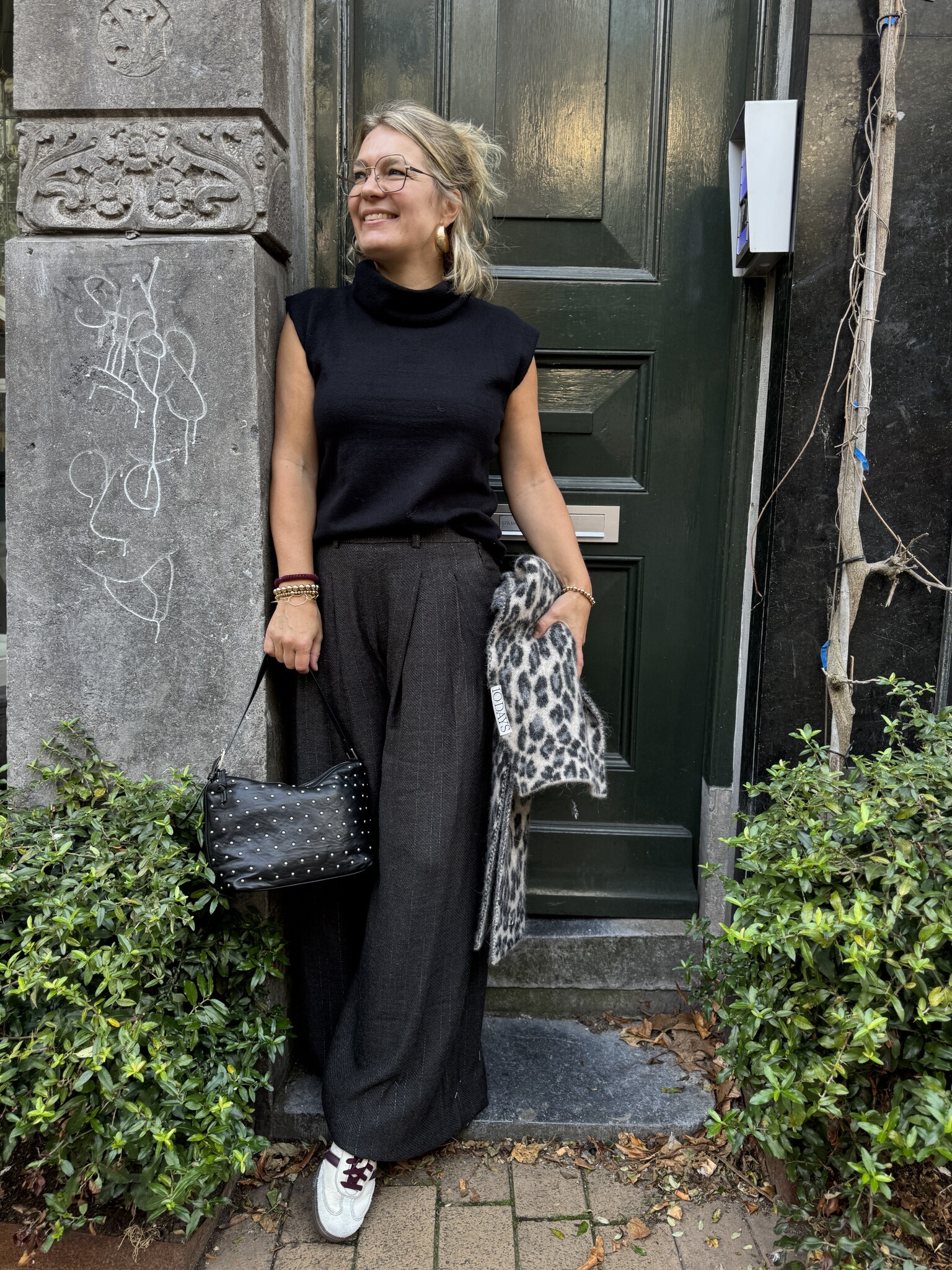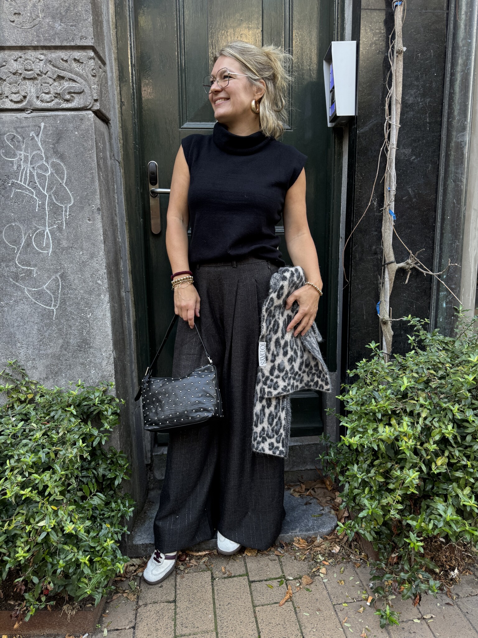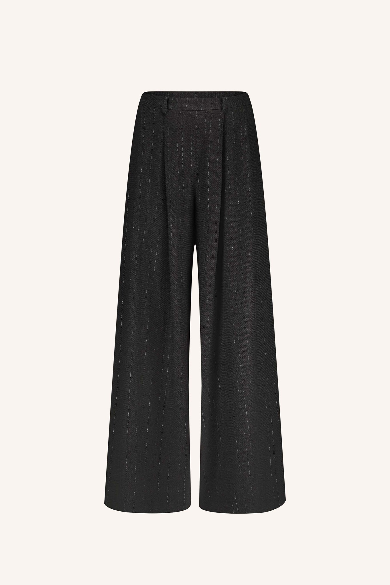 Sef pant van By Bar is een bandplooi broek met echt wijde pijpen en bandplooi. Hij is van 70% viscose, een dikkere soepele stof met een lurexdraadje erdoor. Prachtig! Hij valt iets ruim, in de taille op maat. Sybien draagt s. Hij heeft hele lange pijpen.