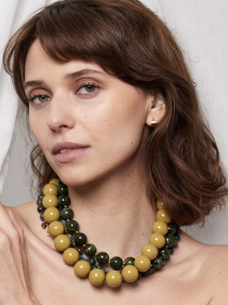 Ellen beekmans korte ketting met grote ronde kralen olijf