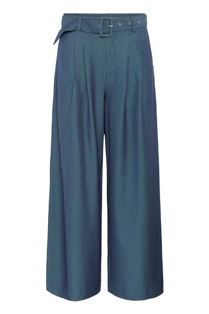 Hele mooie extra wijde pantalon van My Essential Wardrobe. Een set met de bijpassende blouse. Hij is blauw met een krijtstreep. Hij heeft een bandplooi, is highwaist en valt op maat, in de taille iets strakker. Hij is van polyestermix. Sybien draagt36.