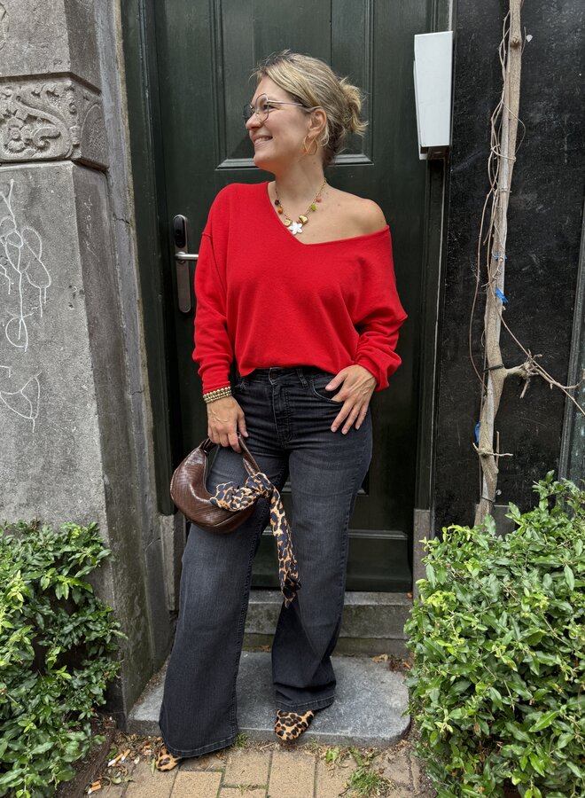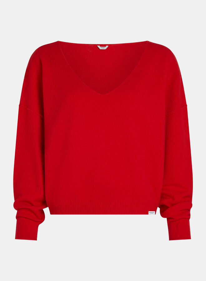 Mooie zachte trui van Penn&Ink. Er zit geen wol in. Hij is van katoen, nylon. Hij heeft een v-hals/boothals met een losse fit. Hij valt ruim, wel een kort model. Sybien draagt xs. Je kan een mt kleiner nemen. Prachtige rode kleur, 1 van de trendkleuren!